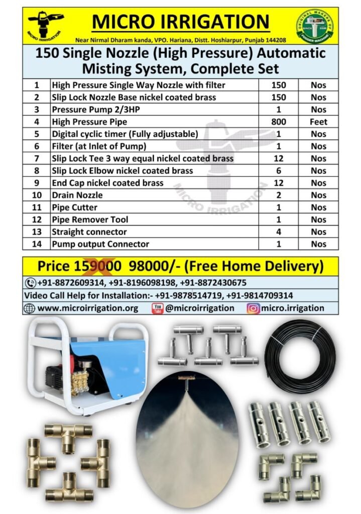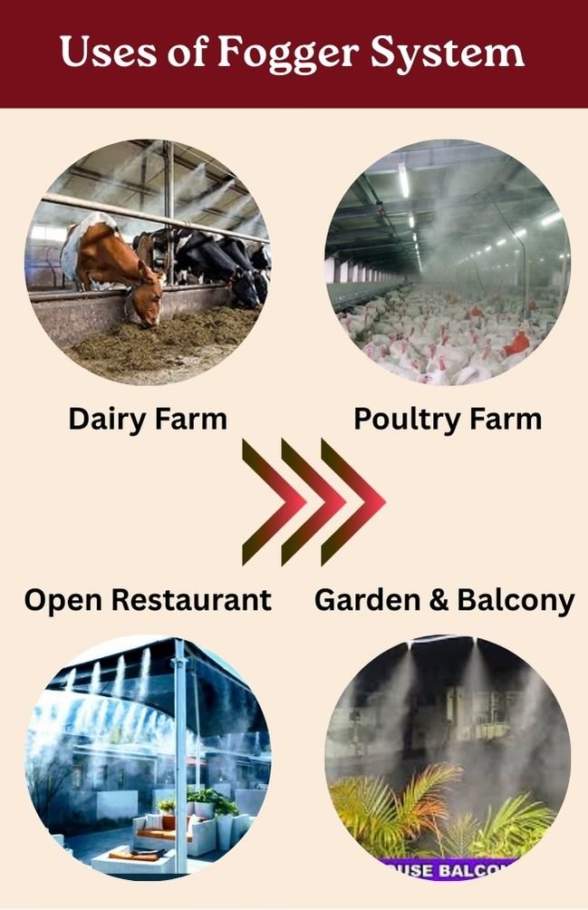 Fogger Kit Uses And Benefits ✅ डेयरी, पोल्टरी फार्म, नर्सरी, पशुपालन, गार्डन, lawn वालो के लिए अत्यधिक फायदेमंद.Fogger system के फायदे :- ✅ये पशुओं को गर्मी से बचाता है. ✅आपके खर्चे की बचत करता है. ✅Temperature को 5 डिग्री तक कम करता है. Our Happy Farmers सर मुझे आज ही फोग्गर मशीन मिला, धन्यवाद आपका ! धन्यवाद सर आपका बहुत अच्छी मशीन है गर्मी से राहत मिली पशुओं को. अच्छी क़्वालिटी की है धन्यवाद Good Fogger machine i am happy. thank you मुझे तो बहुत अच्छी लगी सर शुक्रिया ये बहुत अच्छे से काम कर रही है बढ़िया Quality की है. 10 Single Fogger kit Click here 15 Single Fogger Kit Click here 20 Single Fogger Kit Click here 30 Single Fogger kit Click here 40 Single Fogger kit Click here 80 Single Nozzle Automatic Fogger kit with Timer & Filter Click here 10 Single Nozzle Automatic(High Pressure) Fogger kit Click here 20 Single Nozzle Automatic(High Pressure) Fogger kit Click here 30 Single Nozzle Automatic(High Pressure) Fogger kit Click here 50 Single Nozzle Automatic(High Pressure) Fogger kit Click here 100 Single Nozzle Automatic(High Pressure) Fogger kit Click here 150 Single Nozzle Automatic(High Pressure) Fogger kit Click here 200 Single Nozzle Automatic(High Pressure) Fogger kit Click here अगर आपको किसी तरह की कोई भी समस्या आ रही है तो आप हमारे साथ फ़ोन पर बातचीत कर सकते हैया whatsapp पर पूछ सकते है| हम आपकी सेवा में हाज़िर है Contact us on 88726-09314